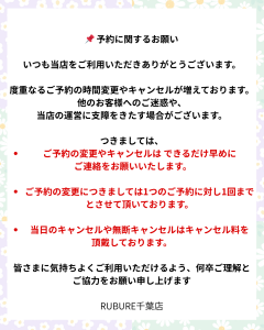 こんにちは! RUBURE千葉店です。 いつもありがとうございます😆 ご予約に関するお願いです😊 当店では、予約の変更・キャンセルは前日までにご連絡をお願いしております。 当日キャンセルや無断キャンセルは、今