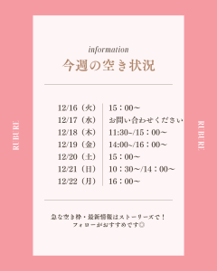 いつもご利用いただきありがとうございます😊 今週な空き状況は以下の通りでございます。 ご都合のよろしいお時間がございましたら、お気軽にご連絡くださいませ❣️ 皆さまのご来店を心よりお待ちしております。 RUB